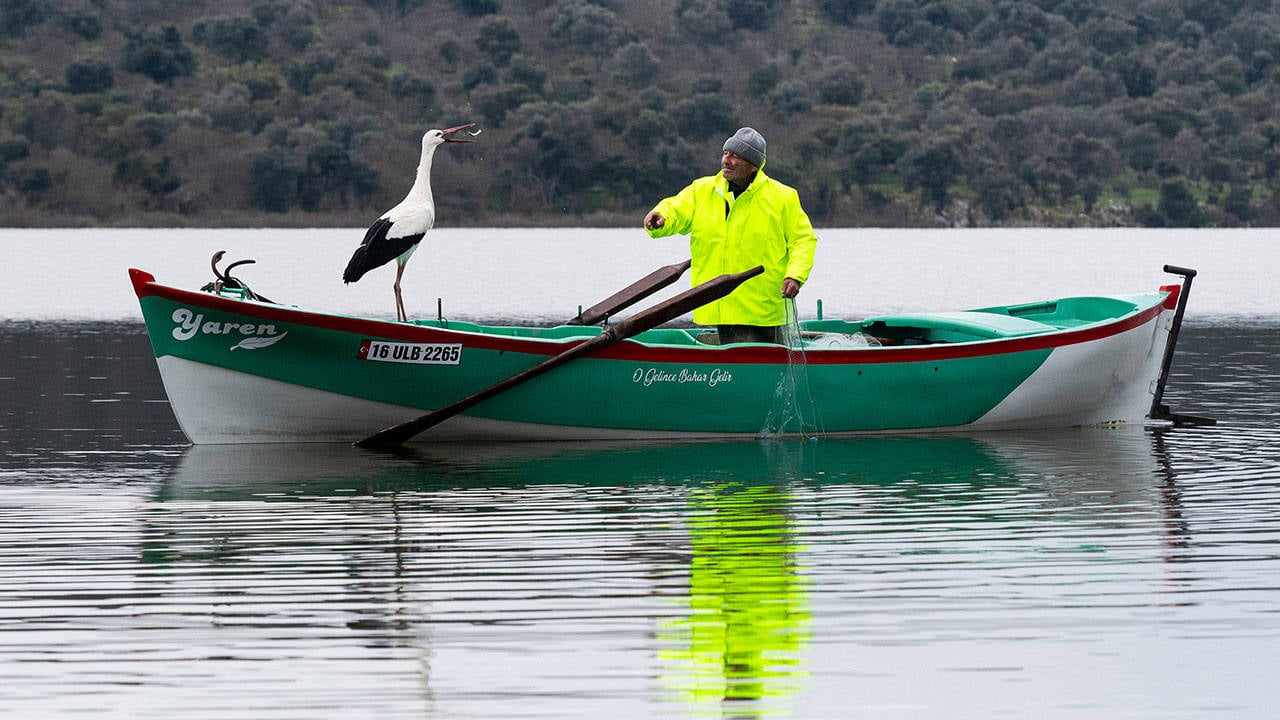Uluabat gölünde balıkçıyla kurduğu dostluk belgesel olan Yaren leylek 15'inci kez Türkiye'ye geldi, sandala kondu.