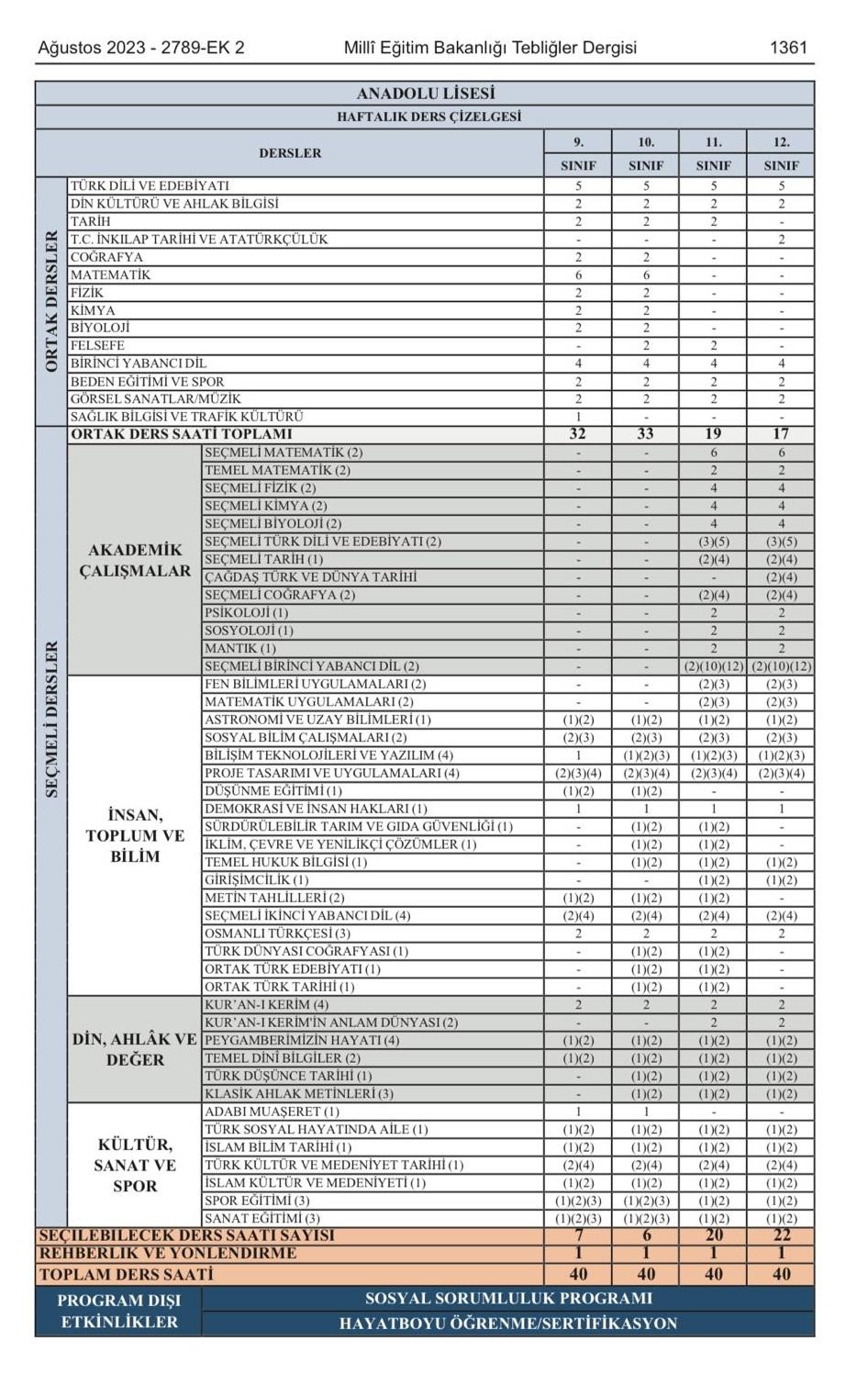 Önceki gün MEB Tebliğler Dergisi’nde yayımlanan listeye göre; lise 9. ve 10. sınıflar her gruptan en az birer ders seçmek zorunda. Bu durum lise 9. ve 10. sınıfların din dersi saatinin, zorunlu din dersi ile en az haftada üç saate çıkması anlamına geliyor. 11 .ve 12. sınıflara ise belirlenen üç kategorinin en az ikisinden en az bir ders seçmeleri zorunluluğu getirildi. Ortaokullarda da seçmeli dersler zorunlu tutuldu ve burada da iki olan zorunlu din dersi 4 saate çıkarıldı.