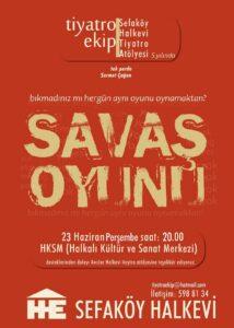 Sermet Çağan imzalı ‘Savaş Oyunu’ en temel hak olan yaşam hakkını araç haline getiren savaşların kimler için olduğunu sorgularken ‘barış’ için mücadele etmek gerektiğini söylüyordu. Oyunun sloganı da bu mücadelenin en temel sorusuydu: “Bıkmadınız mı her gün aynı oyunu oynamaktan?” Oyun, Küçükçekmece’de bir salonda oynandı, yüzlerce insan ekibi neşesiyle motive eden Kadir’i, arkadaşlarını ve oyunu ayakta alkışladı.