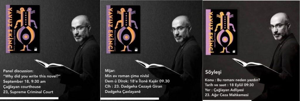 Yazar Yavuz Ekinci birkaç gün önce Türkçe, İngilizce, Almanca, Kürtçe, Arapça gibi farklı dillerde bir söyleşi duyurusu paylaştı. Söyleşi ‘Bu romanı neden yazdın?’ başlığını taşıyordu. İlginç bir yer seçilmiş söyleşi için: Çağlayan Adliyesi. Söyleşi için de çok erken bir saat tercih edilmiş: 09.30.