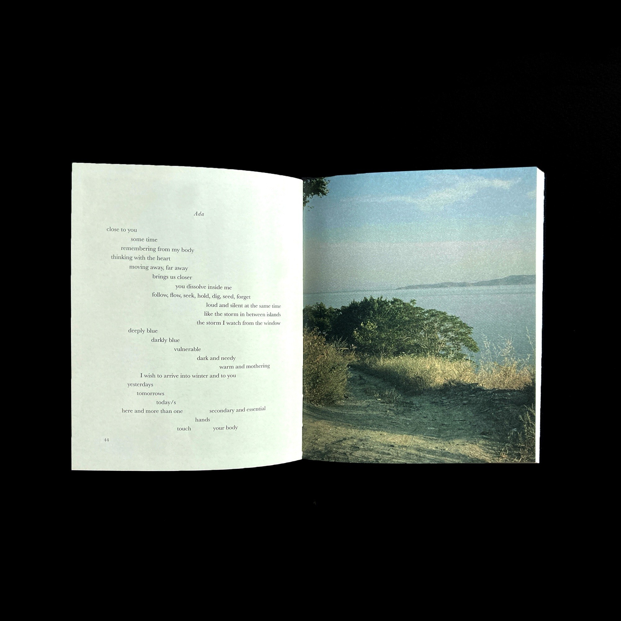 Sergideki çalışmasına gelecek olursak… Salona girdiğinizde, uzun bir duvar boyunca izleyicileri karşılayan çalışmasının ilham kaynağı Marmara Denizi ve Astrida Neimanis’in yazıları. Özdemir, Marmara Denizi çevresinde gezinen fotoğraf, şiir ve fragmanların buluştuğu bir kitap ve insan bedenini su kütlesi olarak algılama önerisi sunuyor. Sanatçı yaratım süresini okuyarak ve suyu düşünerek geçirmiş: “Yaratım sürecinde beni okumak ve su ile düşünmek destekledi. Buna paralel olarak fotoğraf çekmek, fotoğraflara ve sanatçı kitaplarına bakmak, iklim krizi konusunda, deneyimler ve teoriler çevresinde konuşmak, bunlara ek olarak yazmak, kağıt üzerindeki alana ve yazmaya deneysel ve akışkan olarak yaklaşmak da bu sürecin büyük ve önemli bir parçasıydı.”