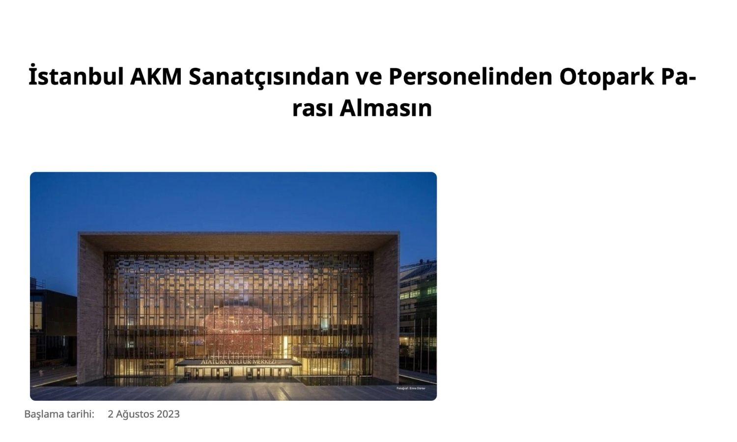 Atatürk Kültür Merkezi çalışanları kendi ceplerinden ödedikleri otopark ücretinden şikayetçi. Sanatçılar ve kurum çalışanları, indirimli haliyle günlük 75 TL'ye varan bir ücret ödüyor ve soruyorlar:"Neden kendi cebimizden ödüyoruz?" Sanat kurumu çalışanları konuyla ilgili imza kampanyası başlattı.