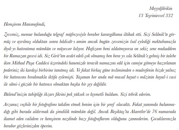 Atatürk’ün mektuptaki ifadesine göre iki süt kardeş Selanik’te 13 Ocak-11 Şubat 1899 tarihleri arasında tanıştılar ve 1916’ya kadar bir daha iletişime geçmediler.