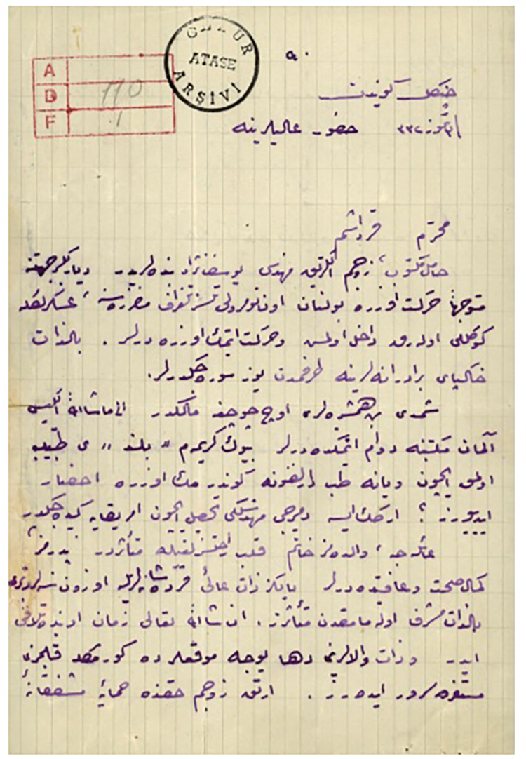 Saime Hanım mektubunda annesi ve babasının sağlık durumlarından söz ettikten sonra ikisinin de uzun zamandır Mustafa Kemal Paşa ile görüşememeleri nedeniyle duydukları üzüntüyü ifade ediyor.