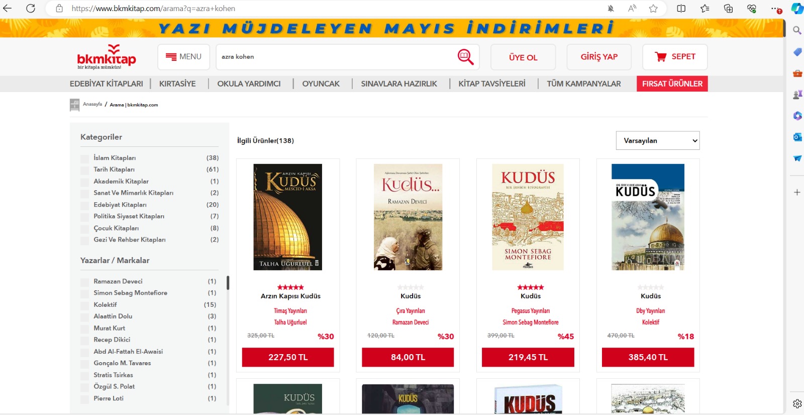 BKM Kitap’ta Azra Kohen’in ismi aratılınca Filistin’le ilgili kitaplar listeleniyor.