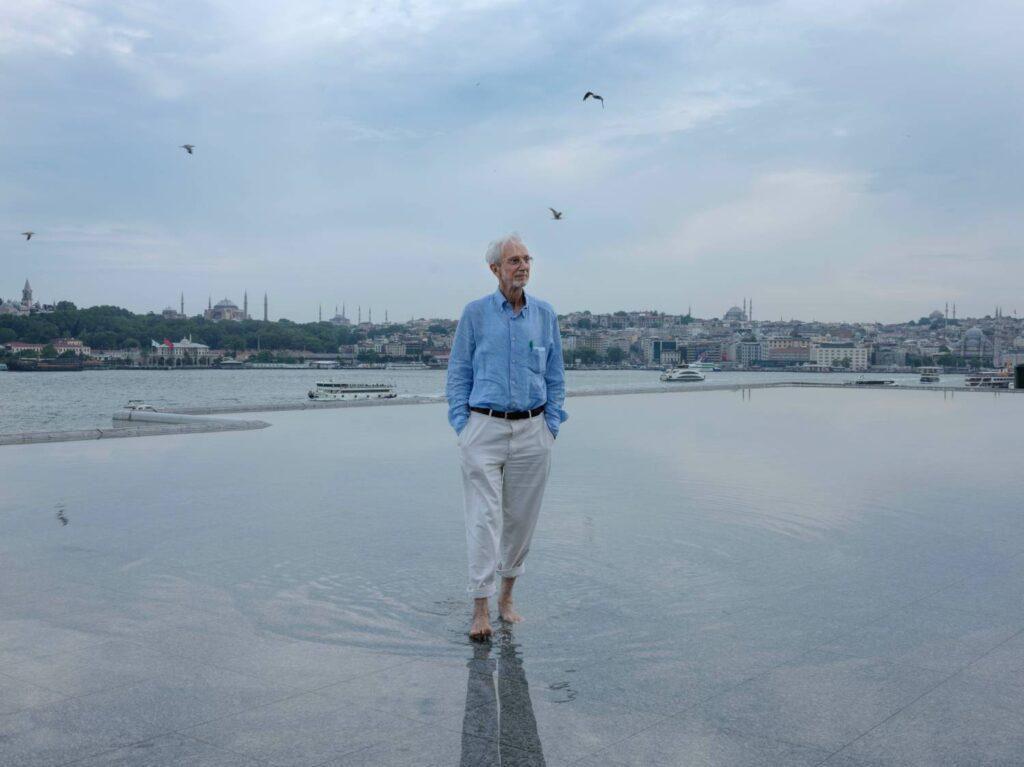 Mimar Renzo Piano, kendi imzasını taşıyan İstanbul Modern’in terasındaki havuzda poz verdi.