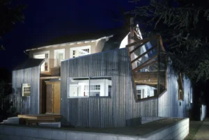 Ancak 1989’da prestijli Pritzker Mimarlık Ödülü’nü kazanan Gehry, adını çok daha önce duyurmuştu. 1978’de, tasarlayıp kırk yıl boyunca içinde yaşadığı Santa Monica, Kaliforniya’daki ucuz, ahşap çerçeveli bir Cape Cod bungalovunun tamamlanmasıyla mimarlık dünyasının gündemine girdi. Gehry, bu bungalovu parçalayıp kontrplak, oluklu metal ve zincir bağlantılardan oluşan yeni bir kaplamayla kapladı.