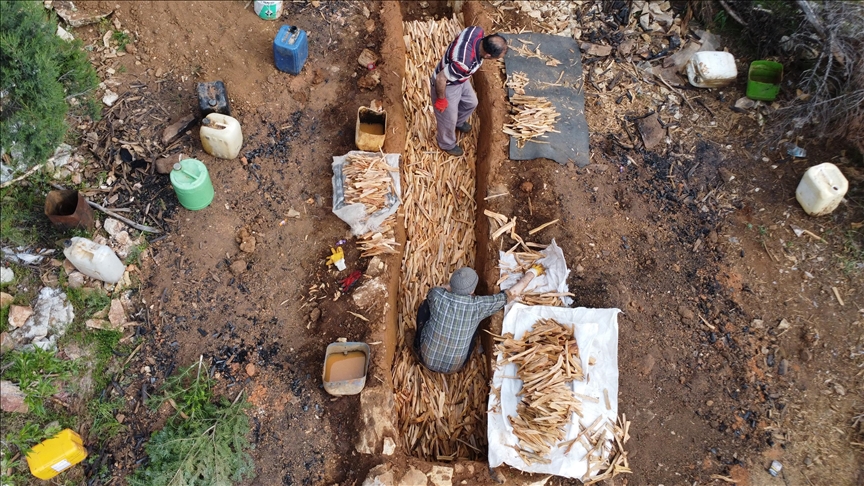 Kuyucak Mahallesi sakinleri sedir katran yağı üretimi için bölgedeki 2500 rakımlı dağlarda yetişen sedir ağaçlarının kuruyan köklerini topraktan özenle çıkarıyor.