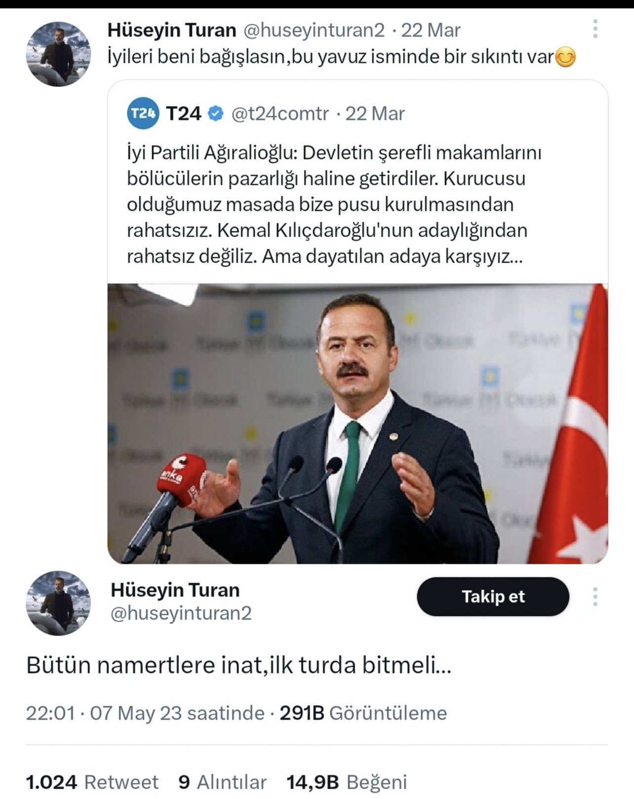 Ak Partili belediye başkanı tarafından toplumsal değerlerle aykırı düşmek ve milli iradeye saygısızlık yapmakla itham edilen Hüseyin Turan, seçim sürecinde Twitter hesabından bazı paylaşımlar yapmış ve Millet İttifakı’nın cumhurbaşkanı adayı Kemal Kılıçdaoğlu’nu desteklediğini belli etmişti.