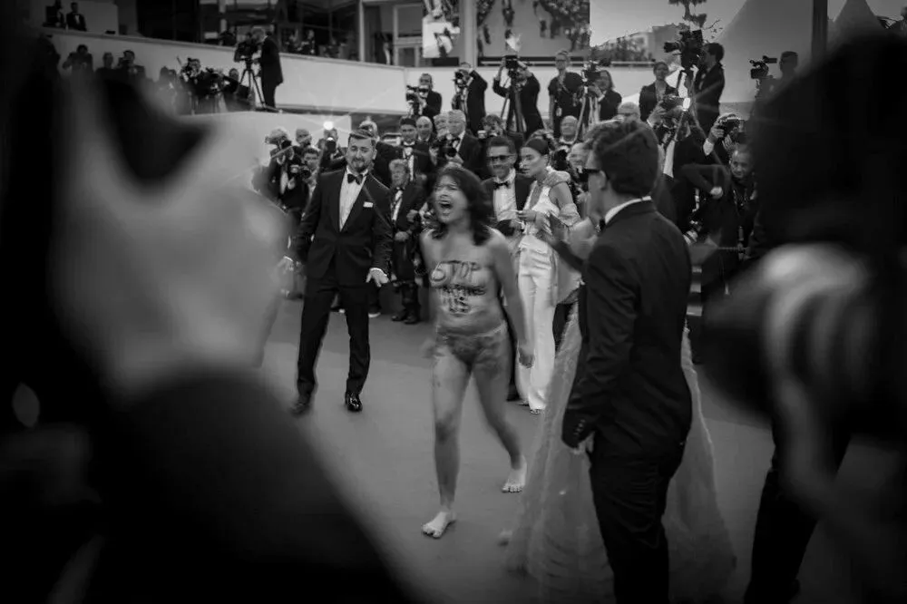 Fransa’da süren Cannes Film Festivali, Rusya’nın Ukrayna’yı işgaline karşı çıplak protestoya sahne oldu. Kırmızı halıya çıkan bir kadın ceketini çıkararak Ukrayna’nın bayrak renkleriyle boyalı vücuduna “Bize tecavüz etmeyi bırakın” yazdı. Rus güçlerinin savaşta pek çok tecavüz suçuna karıştığı iddia ediliyor.
