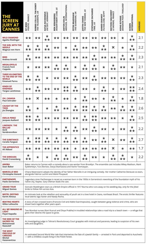 Altın Palmiye yarışında filmler gösterile dursun Screen dergisinin geleneksel yıldız tablosu Cannes’daki filmlerle ilgili bir fikir veriyor. Sinema yazarlarının puanlarından oluşan yıldız tablosunda şimdiye kadar gösterilen filmler arasında 4 puan üzerinden ortalaması 3’ü bulan film yok. Coralie Fargeat imzalı ‘The Substance’ 2.7 ortalama ile yarışı önde götürüyor. Onu 2.6 ortalama ile Jia Zhanqke imzalı ‘Caught by The Tides’ filmi takip ediyor.
