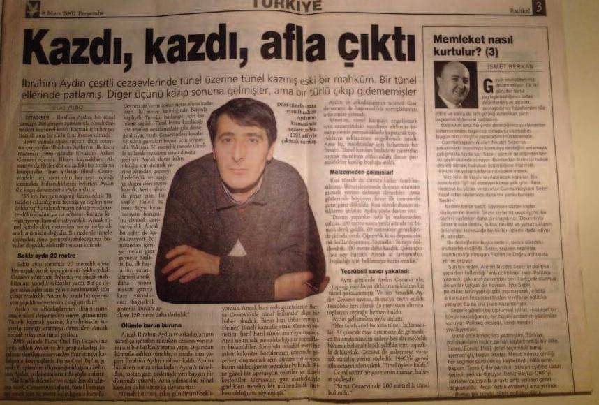 Haa daha bitmedi! Çıktıktan üç yıl sonra da gazetede başka bir haber gördüm: Bizim Bursa’daki tünel çökmüş. Hapishane duvarının önündeki araç yolu göçmüş. Nasıl olur diye bakmışlar ki tünel var. Yani düşün, 3 yıl dayanmış o tünel! Bazen keşke o tünelden çıksaymışız diyorum. Çıksaydık devletin en güvenli hapishanesini batırmış olacaktık. Gerçi çıkmasak da o tünelle bunu yaptık.