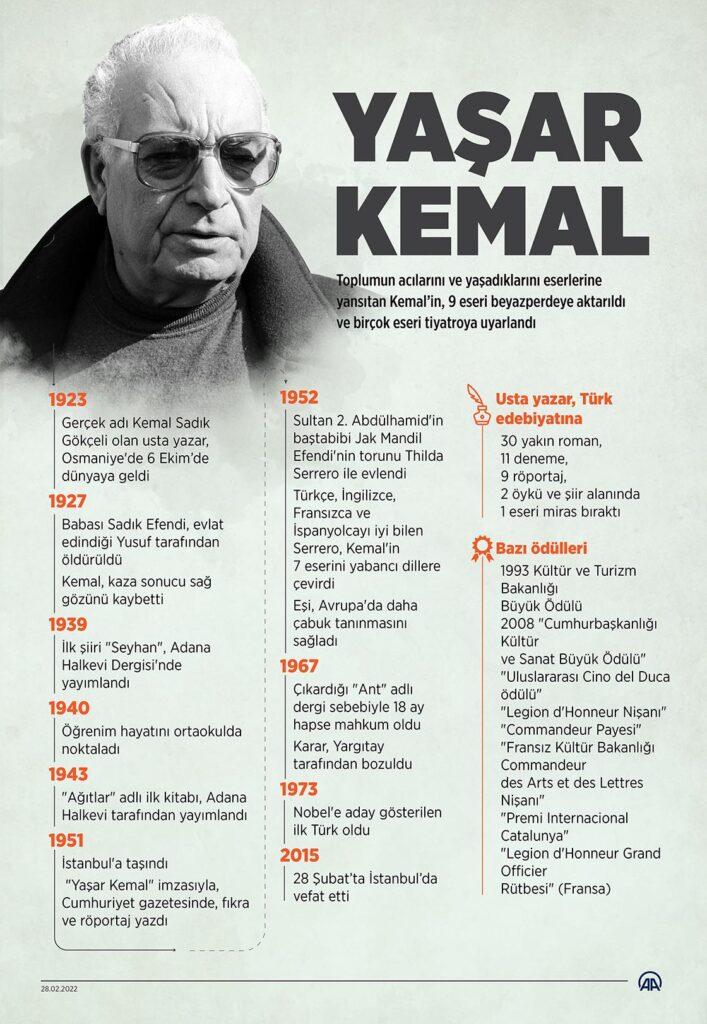 Yaşar Kemal, edebiyatımız için bir mihenk taşıdır. Usta yazar eserleri, hayattaki duruşu, romanlarına yansıyan Anadolu insanına duyduğu sevgi ile bu toprakların mağdur olan insanlarının, büyük acılarının destanını yazdı. O destanı bize miras bıraktı. Büyük yazarı 100 yaşında saygıyla anıyoruz.