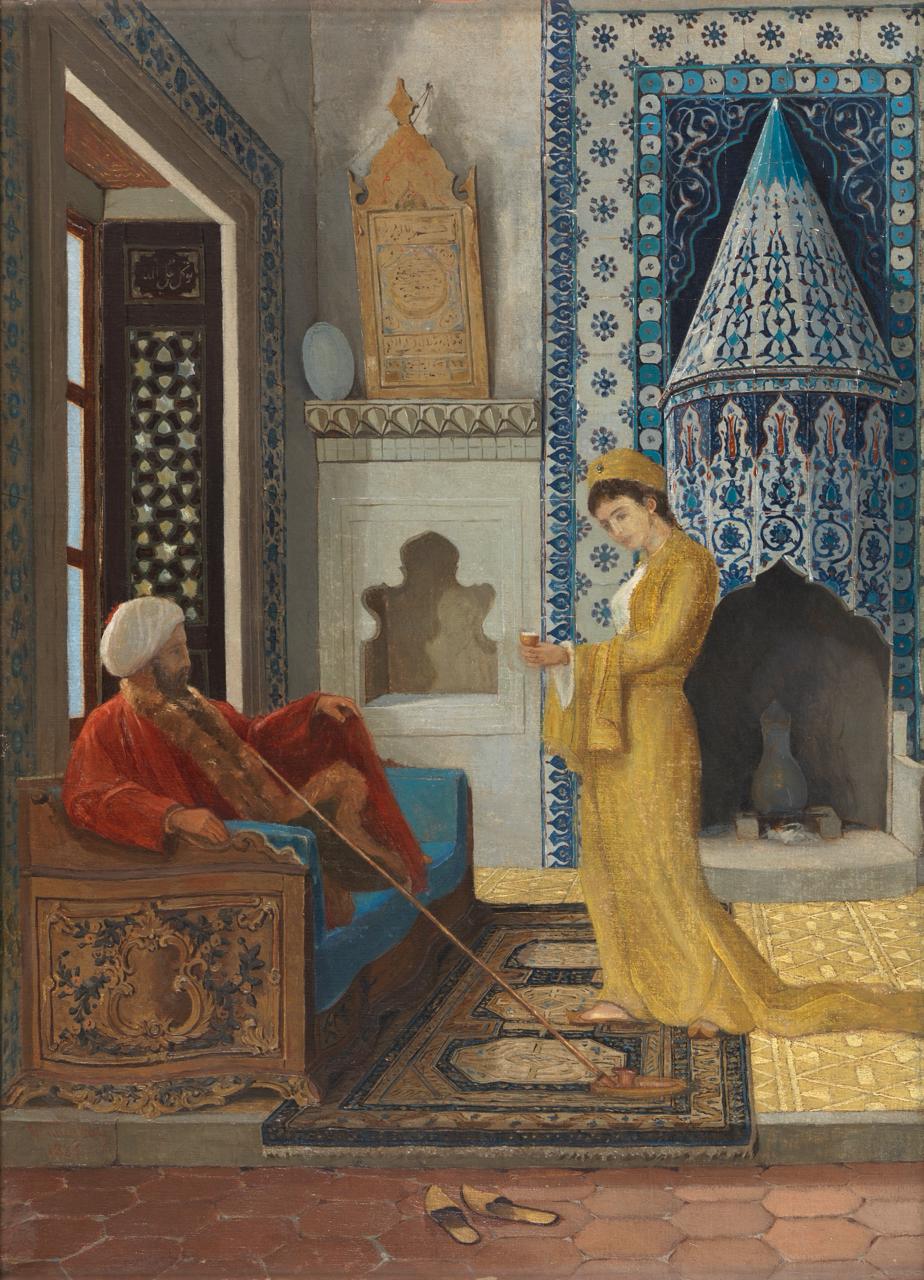 Osman Hamdi Bey’in 1886 tarihli ‘İftardan Sonra’ tablosu da serginin yıldızlarından biri. Bu tabloyla birden yüzyıl öncesine, bir konağa ‘ışınlanıyoruz.’ Orta yaşlarda olduğu tahmin edilen “evin beyine” cariyesi kahve ikram ediyor. Elindeki kahvenin dumanı üstünde… Osman Hamdi Bey’in bu tablosu da Türk kültürünün vazgeçilmez ögelerinden kahvenin resme yansımasının bir örneği. Ürünler Sunulurken başlıklı bölümde resmi bulabilirsiniz.