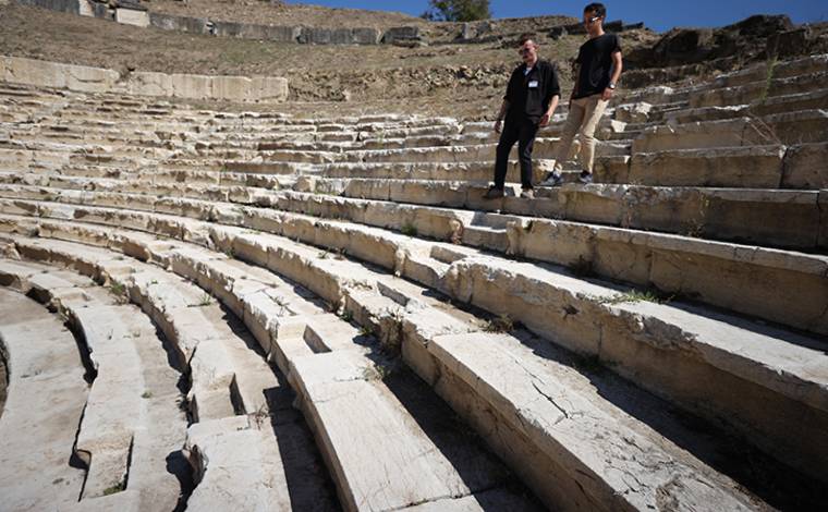 Çalışmaların kazı alanı genişletilerek sürdürüldüğünü aktaran Erdoğan, şöyle devam etti: “Tiyatronun orta alanındaki zemine kadar ulaştık. Aynı zamanda çevredeki sınır duvarlarının belirlenmesi noktasında bir sonuca vardık. Tiyatronun en üst bölümünde kazı çalışmalarına başladık. Bu alanda yaptığımız çalışmalarda karma bir toprağa rastladık. Bu alanda Roma’dan sonra Bizans, Osmanlı ve erken Cumhuriyet dönemlerinde hem tarım yapılmış hem de yeni alanın üzerine yeni yapılar kurulmuş. Buralarda heykel parçalarına rastladık. Bunlardan en çarpıcısı geçtiğimiz günlerde tespit ettiğimiz Büyük İskender başı oldu