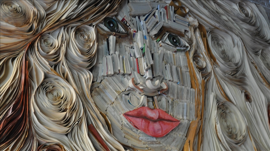 “Sıfır atık” prensibiyle çalışan Çetinsoylu, kitap sayfalarını kullanarak bir hafta sonunda işletmenin iç duvarına 3 metre uzunluğa, 3 metre genişliğe sahip, uzun saçlı bir kadın yüzünün tasvir edildiği portre hazırladı.