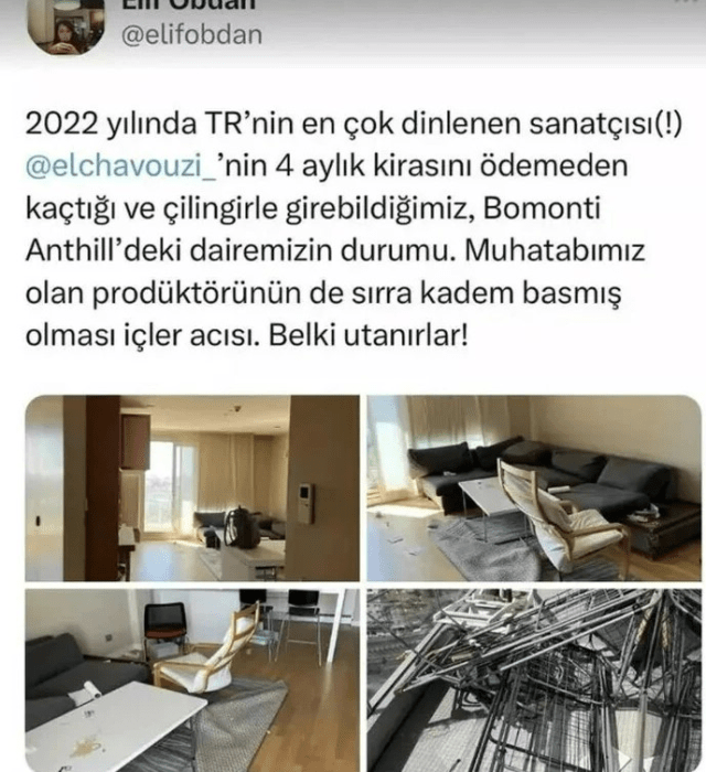 Ev sahibi Elif Obdan paylaşımında, “2022 yılında TR’nin en çok dinlenen sanatçısı(!) Uzi’nin 4 aylık kirasını ödemeden kaçtığı ve çilingirle girebildiğimiz, Bomonti’deki dairemizin durumu. Muhatabımız olan prodüktörünün de sırra kadem basmış olması içler acısı. Belki utanırlar!” dedi.