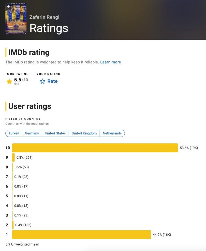 Haberi yayına hazırladığımız sırada dünyanın çeşitli yerlerinde toplam 35 bin kişi ‘Zaferin Rengi’ne puan vermişti. Türkiye’den ise filmi 25.535 kişi puanlamış. Türkiye’de 19 bin kişi filme 10 puan verirken 16 bin kişi de bir puanı layık görmüş. 535 kişi ise iki ile dokuz arasında puan vermiş filme.