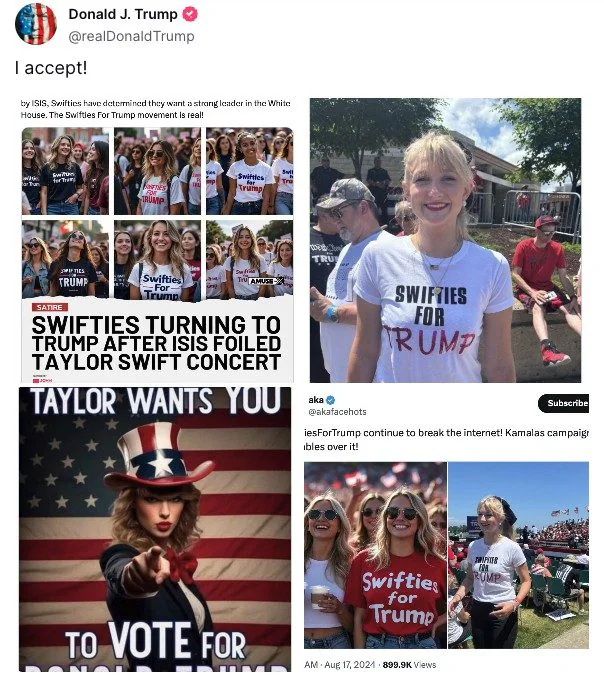 ABD Başkan adayı Donald Trump yapay zekayla üretilen fotoğrafları gerçek sandı, Taylor Swift'in fanlarının kendisini desteklediğini duyurdu, 'Ben de desteği kabul ediyorum' dedi. Ama kabul ettiğini söylediği desteğin 'parodi' olduğu açıkça yazılıydı.