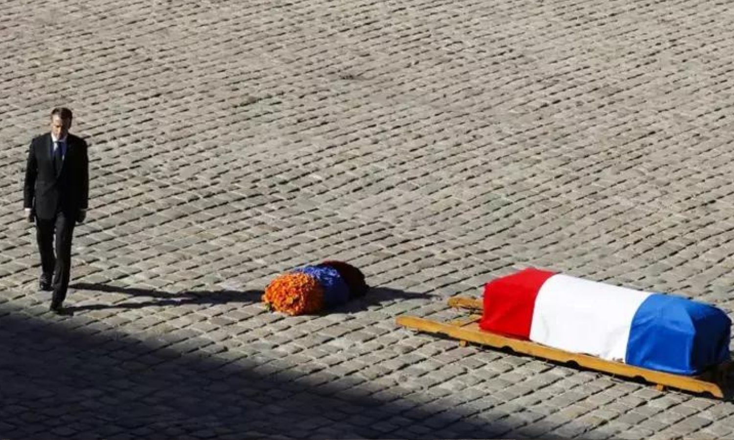 Fransa Cumhurbaşkanı Emmanuel Macron, Napoleon’un da anıt mezarının bulunduğu Les Invalides’de düzenlenen cenaze töreninde Charles Aznavour’un tabutu önünde saygı duruşunda bulunuyor.