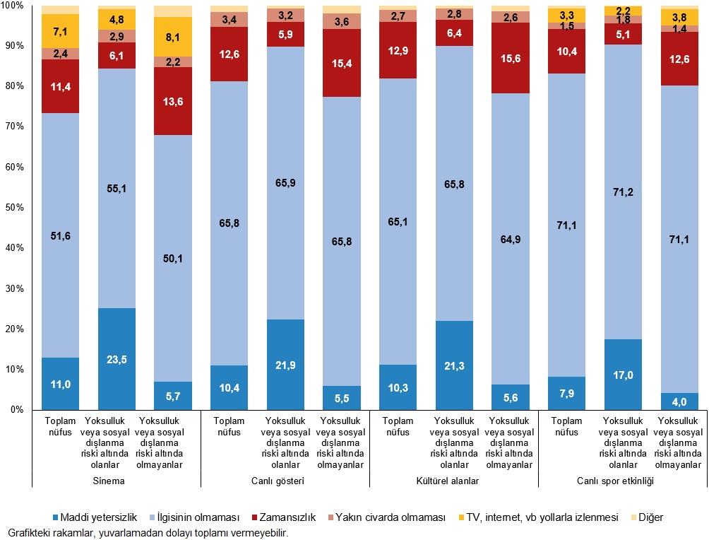 Peki neden? Yoksulluk ve sosyal dışlanmak riski en büyük faktör. Fakat veriler ilginç bir şey de söylüyor bize. Yoksulluk veya sosyal dışlanma riski altında olmayanların %50,1’i de sinemaya gitmiyor. Neden mi? Cevap ilgisizlik.