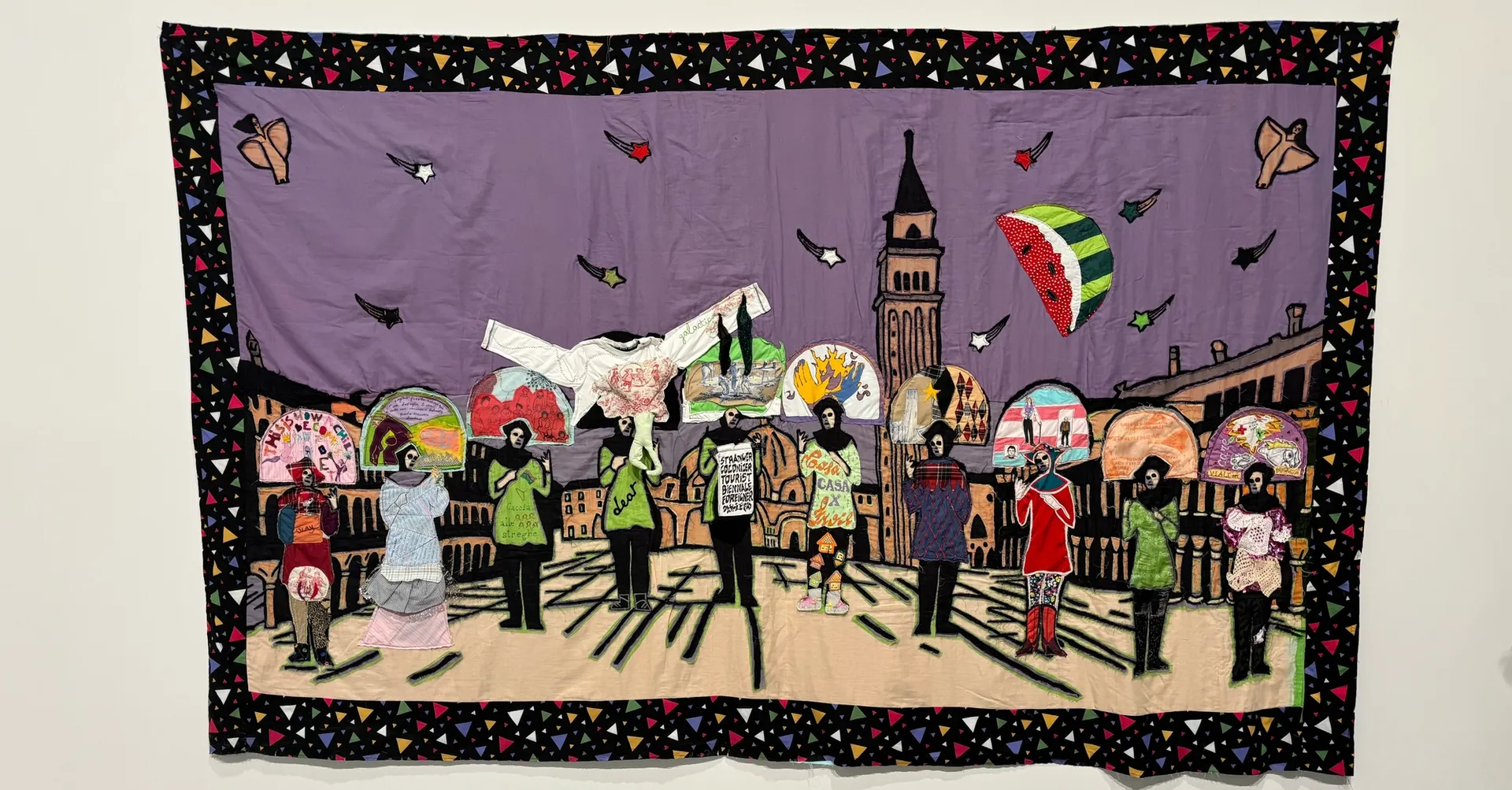 “Çok heyecanlı bir süreç. Andrino Pedrosa’nın İstanbul’da atölyemi ziyareti sonrası davet aldım. O dönem atölyemde Endonezya’da yapılan Jogja Bienali için üzerine çalıştığım bir pankart bulunuyordu. 2010’dan beri devam ettirdiğim bu seri projemle çok ilgilendi ve Venedik Bienali için iki yeni pankart üretmemi teklif etti. Yedi ay İstanbul’da ön çalışması oldu. Çokça eskiz çizdim, nasıl bir süreç olacağını tasarladım ve sonunda üçer metrelik iki büyük pankart diktim. Bu ön çalışma Venedik’te buluşacağım Coges Don Milani ve Casa Punto kolektifleri için hazırladığım tasarımlardı. Birinci pankartta gondollarda ilerleyen anonim kadın figürlerinin su üstünde güneşli bir Venedik fonunda ilerleyen görüntüsü, diğerinde ise kayan yıldızlarla dolu bir gecede San Marco Meydanı’nda görünen anonim figürler oldu.