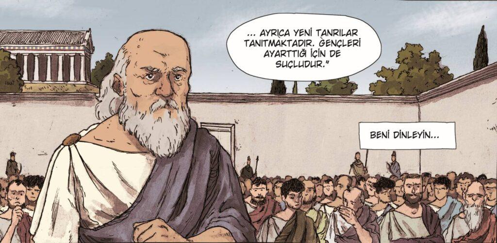 Milano Üniversitesi Teorik Felsefe bölümü mezunu olan gazeteci Stefano Cardini, birkaç yıl önce geçmişte birlikte çalıştığı grafik roman senaryolarına imza atan Francesco Barilli ve birkaç arkadaşına Sokrates’i çizgilerle yeniden hatırlatmanın önemi üzerine lafladığını belirtiyor. Barilli ise bu muhabbetin ardından desenlerine güvendiği Alessandro Ranghiasci’yle birlikte Cardini’den habersiz böylesi bir projeyi ete kemiğe büründürmüş bile. Nihayetinde yakın bir zaman önce, MÖ 399’da yaşanan bu trajik ve büyük bir ders niteliğindeki olay bir grafik romana dönüştürüldü.