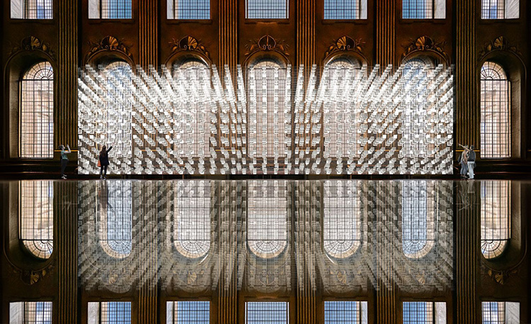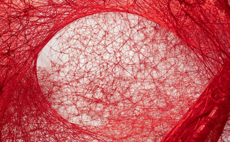 Chiharu Shiota’nın sergideki devasa yerleştirmesi.