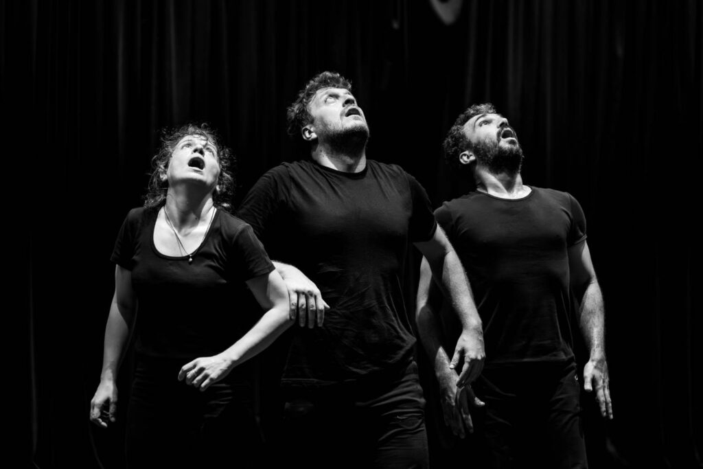 Antik Yunan tragedyalarının isimsiz habercilerinden üçü, Çağdaş Ekin Şişman, Adem Mülazim ve İbrahim Can Sayan’ın -izlerseniz göreceksiniz, laf olsun diye söylemiyorum- handiyse kusursuz clownesk performanslarına teslim. ‘Dört bir yanı cennet yurt Thebai’nin kuruluşuna ve ardı ardına ‘iktidara gelip’, sıra sıra ‘kahramanca/cesurca/onurluca vs…’ göklere yükselen kralların öykülerini anlatacaklar bize. Çıplak sahnenin arkasını kaplayan üç parça uzun beyaz flamaya yansıyan videolar, oyunun (sesle birlikte) adeta dördüncü oyuncuları olan (perdeye yansıyan) sözler, cümleler Thebai halkının tepesinde dolanan kaderin anlatısını kuruyor önümüze.