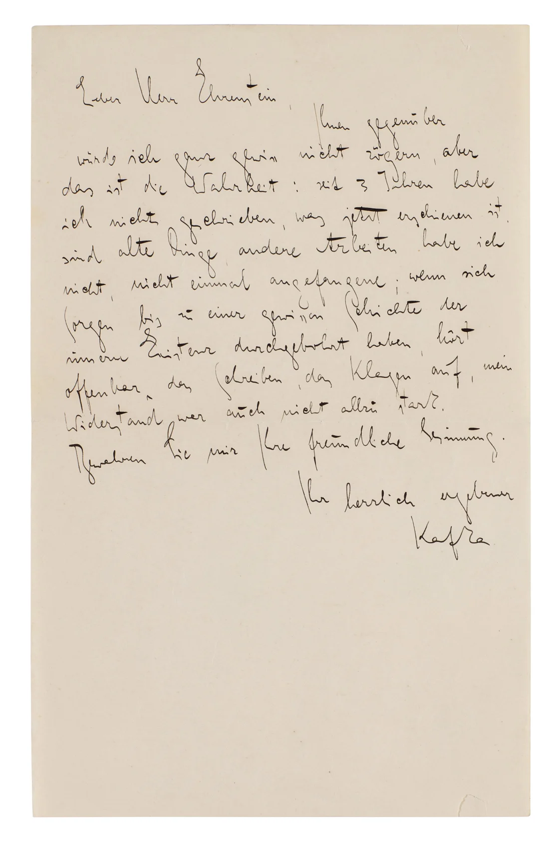 Tarih atılmamış mektubun Kafka’nın Kuzey İtalya’nın Merano kentindeki bir klinikte tedavi gördüğü 1920 yılının nisan ve haziran ayları arasında yazıldığı tahmin ediliyor. Yazma sürecindeki tıkanma hallerinin Kafka’yı hayatı boyunca rahatsız ettiği, ancak fiziksel durumunun kötüleşmesiyle daha da kötüye gittiği söyleniyor. Kibar ve okunaklı bir Almanca ve düzgün bir el yazısıyla yazılmış mektubun yayıncısı Ehrenstein’ın o sırada editörlüğünü yaptığı dışavurumcu edebiyat dergisi Die Gefährten’e (Dostlar) Kafka’nın da katkıda bulunması talebine yazarın yanıtı olduğu düşünülüyor.