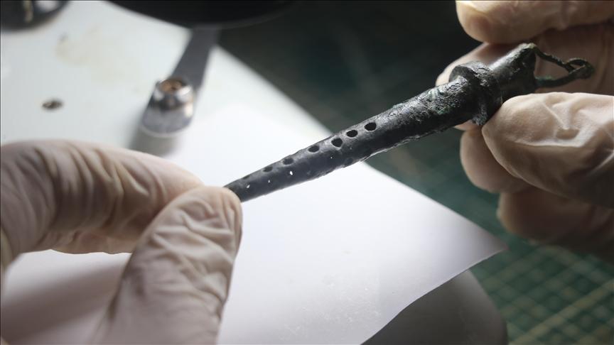 “Bu çalışmalar esnasında önemli buluntulara ulaştık” diyen Çeklikbaş, “Bu buluntulardan bir tanesi de filtre olarak kullanılan bronz bir obje. Antik dönemde insanların içeceklerini içerken posasından içeceği ayırmak için kullandıkları bir obje bu filtre. Pipetlerin ucuna takıyorlar. Bu pipet yaklaşık bir metre uzunluğunda oluyor. Ortaya koydukları bir kabın içerisinden de insanlar hem sohbetlerini yapıyorlar hem de içeceklerini içiyorlar” ifadelerini kullandı.