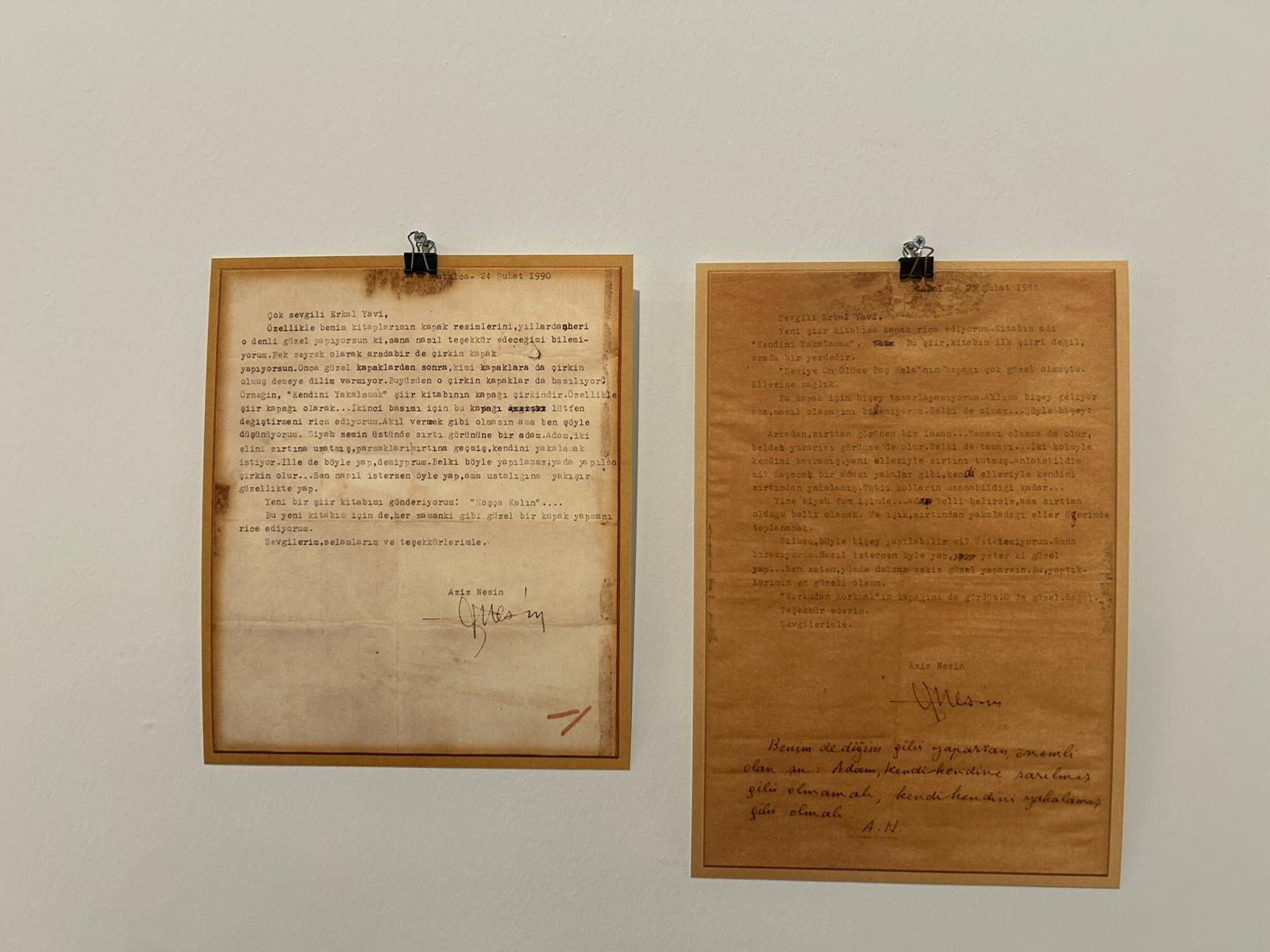 Serginin üçüncü katına çıktığınızda duvarda sizi iki mektup karşılayacak. Biri 1985 diğeri 1990 tarihli bu iki mektup, usta yazar Aziz Nesin’den tasarımcı Erkal Yavi’ye. Nesin mektubunda Yavi’ye teşekkür ediyor ancak açık sözlülüğü de elden bırakmıyor.