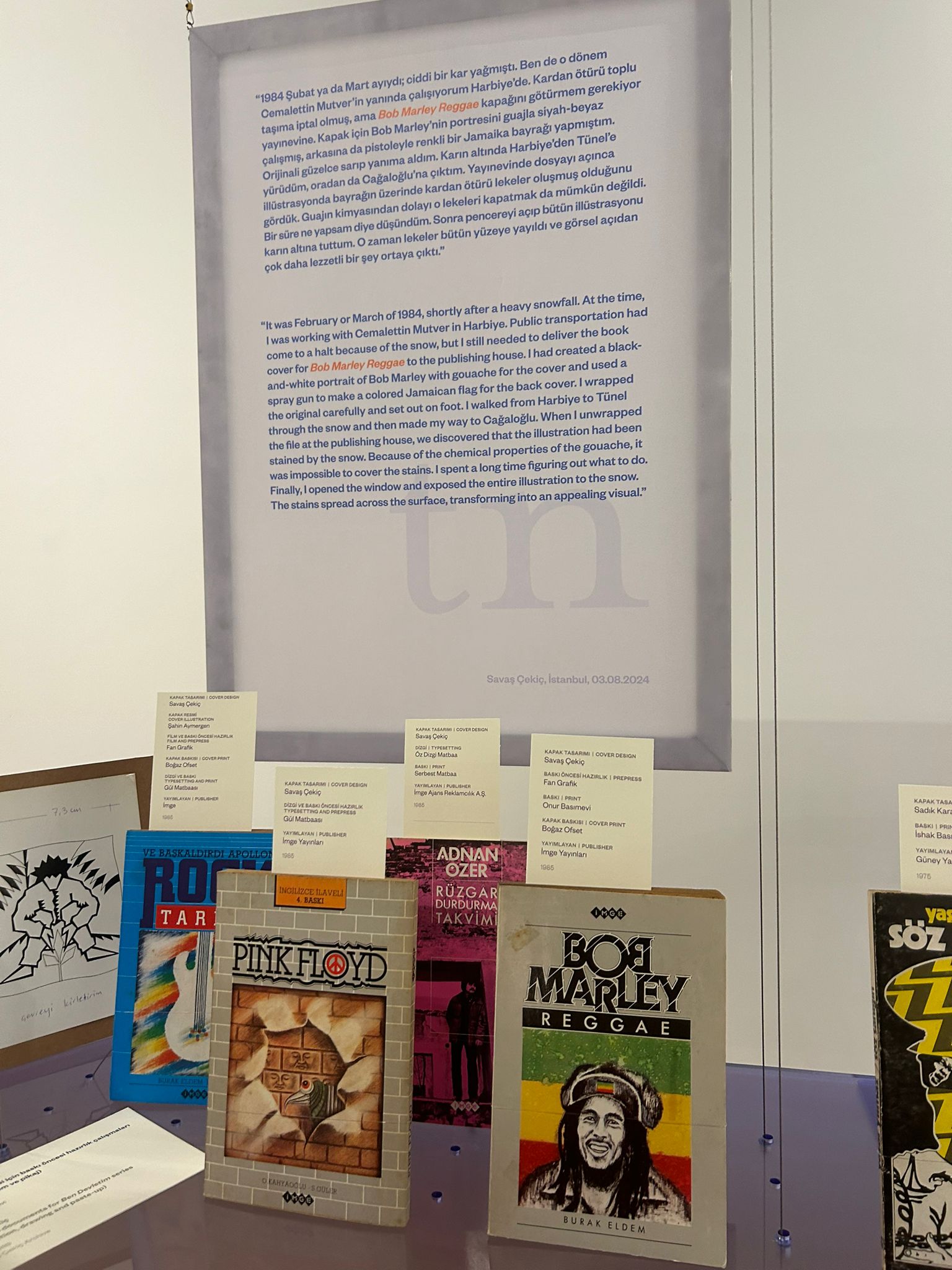 Serginin, sözü tasarımcılara bırakmasının en güzel yanı son haline nasıl geldiğini asla bilemediğimiz tasarım süreçlerini öğrenip işin mutfağına sızmak. Örneğin Burak Eldem’in 1985 tarihinde yayımlanan kapak tasarımı Savaş Çekiç’e ait ‘Bob Marley Reggae’ kitabı. Çekiç karlı bir İstanbul günü guaj boyayla hazırladığı kapağı yayınevine götürürken(evet, bir zamanlar çizimler bu şekilde ‘elden’ gidiyordu) ıslanan tasarımı nasıl değiştirdiklerini şu sözlerle anlatıyor: