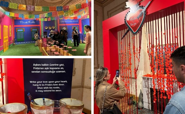 Serginin devamı tam bir Instagram cenneti olarak dizayn edilmiş. Frida Kahlo ve çalkantılı -bugünden bakınca toksik demek geliyor içimden- aşkı Diego’nun ilişkilerinden hareketle büyük bir kalp platformu da var, siz de notunuzu yazın aşkınız sonsuz olsun diye ayrılmış interaktif bir başka bölümde…Eğer fotoğraf çekmek istiyorsanız en çok vakit ayırmanız gereken sergi bu olacaktır, çünkü herkes istiyor! Serginin sonunda bir de defter var. Siz de mektubunuzu yazabilirsiniz.