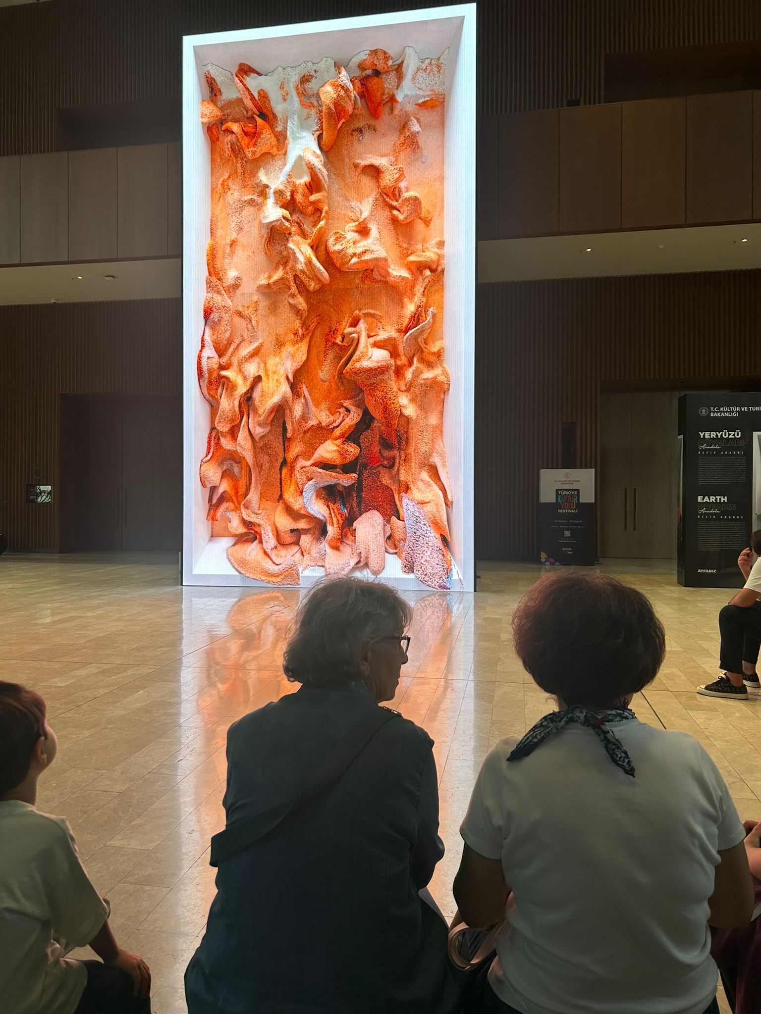 Anadol’un bir süre sonra izleyicileri içine alan çalışmasının tam karşısında uzun koltuklar var. Herkesin elinde telefon, anlık olarak değişen eseri kaydetmeye çalışıyor. Hemen yanlarına oturduğum orta yaşlı iki kadından biri, “Bak, Refik Anadol bu adammış” diyerek telefonundan açtığı fotoğrafı gösteriyor. Bir anlık göz göze gelmemize fırsat bilip “Nasıl buldunuz sergiyi, nereden duydunuz?” söze giriyorum.