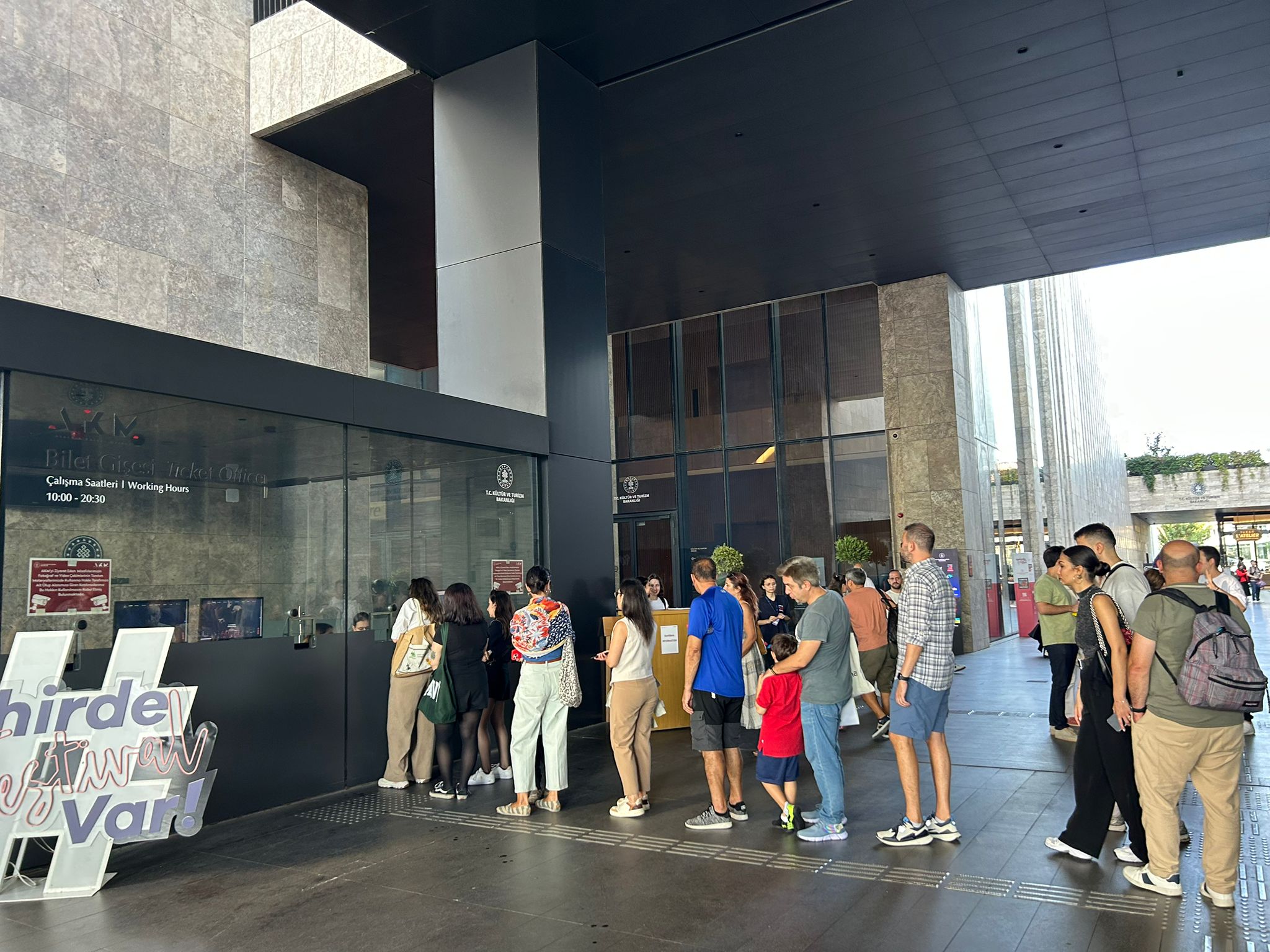 Uzun bir kuyruk. Etrafta boyunlarında görevli yazan gençler… Her biri içeri giren ziyaretçilerin yüzüne bakıyor, herhangi bir soru sorarlarsa hemen cevaplamak için. Ama herkes aynı şeyi soruyor: Bilet mi alacağız?