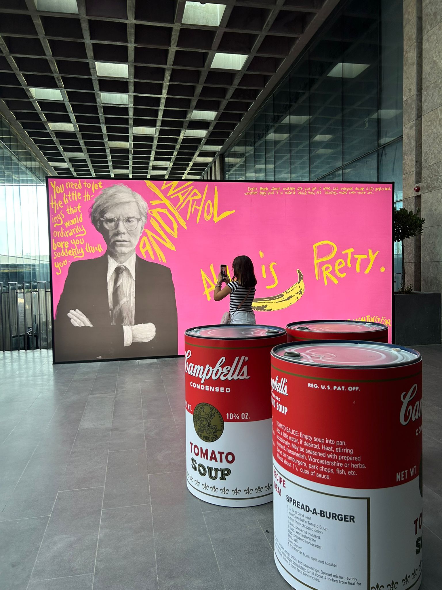 Kalabalıktan sıyrılıp Andy Warhol sergisine doğru yürüyorum. Pembe bir afişle ziyaretçileri çeken serginin girişinde Warhol’un meşhur Campbell’in çorba konserveleri şeklindeki dubalar var. Ziyaretçiler burada bir tur fotoğraf çektirdikten sonra içeri giriyor. Tabii sanatçının alametifarikası gereği sergi tasarımı da rengarenk. Bir anne, küçük oğluna “Bak bu Muhammed Ali, bu Michael Jackson” diyor Warhol’un ünlü isimleri resmettiği seriyi gösterirken.