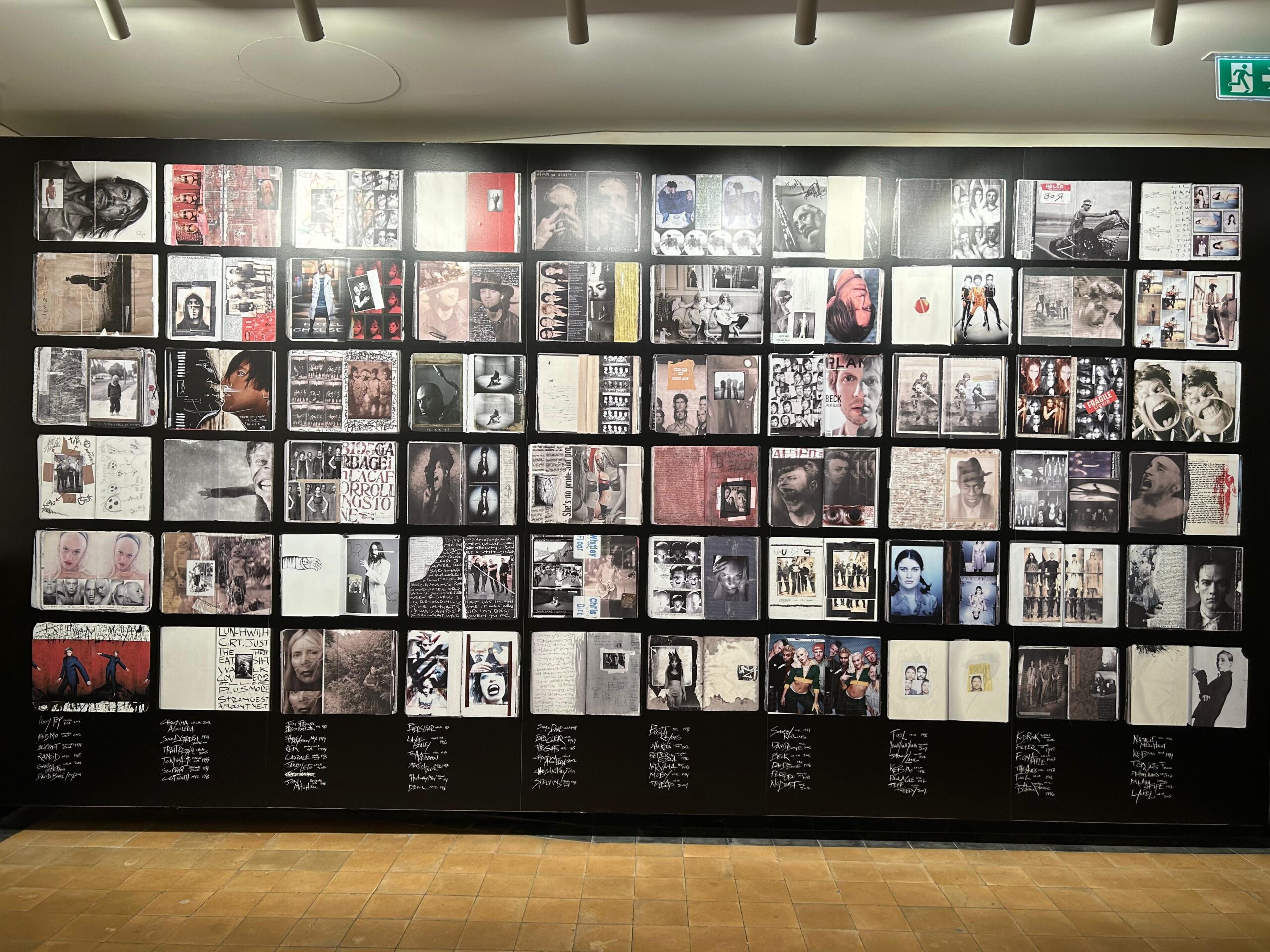 David Bowie, Angelina Jolie, Kurt Cobain ve daha pek çok ünlünün portreleriyle tanınan ABD’li fotoğrafçı Frank Ockenfels III’ün “yalnızca kendisi için hazırlamış olduğu” kolajlardan oluşan sketchbookların kapladığı bir duvar karşılıyor sizi Galata Rum Okulu’nun ikinci katına çıktığınızda. Tabii fonda hemen önündeki ekrandan görülebilen şarkı listesinden parçalar dönüyor. Sonrası tam anlamıyla bir müzik yolculuğu.