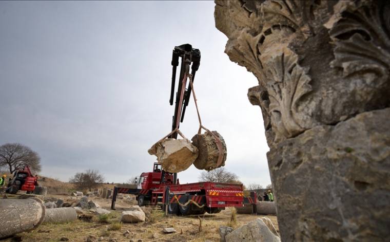 Osmaniye'deki Kastabala Antik Kenti'nde 6 Şubat 2023'teki depremlerde hasar gören sütunlu yolda restorasyon çalışması gerçekleştiriliyor. Çalışmalar sonrası antik sütunlar yeniden eski görüntüsüne kavuşacak.