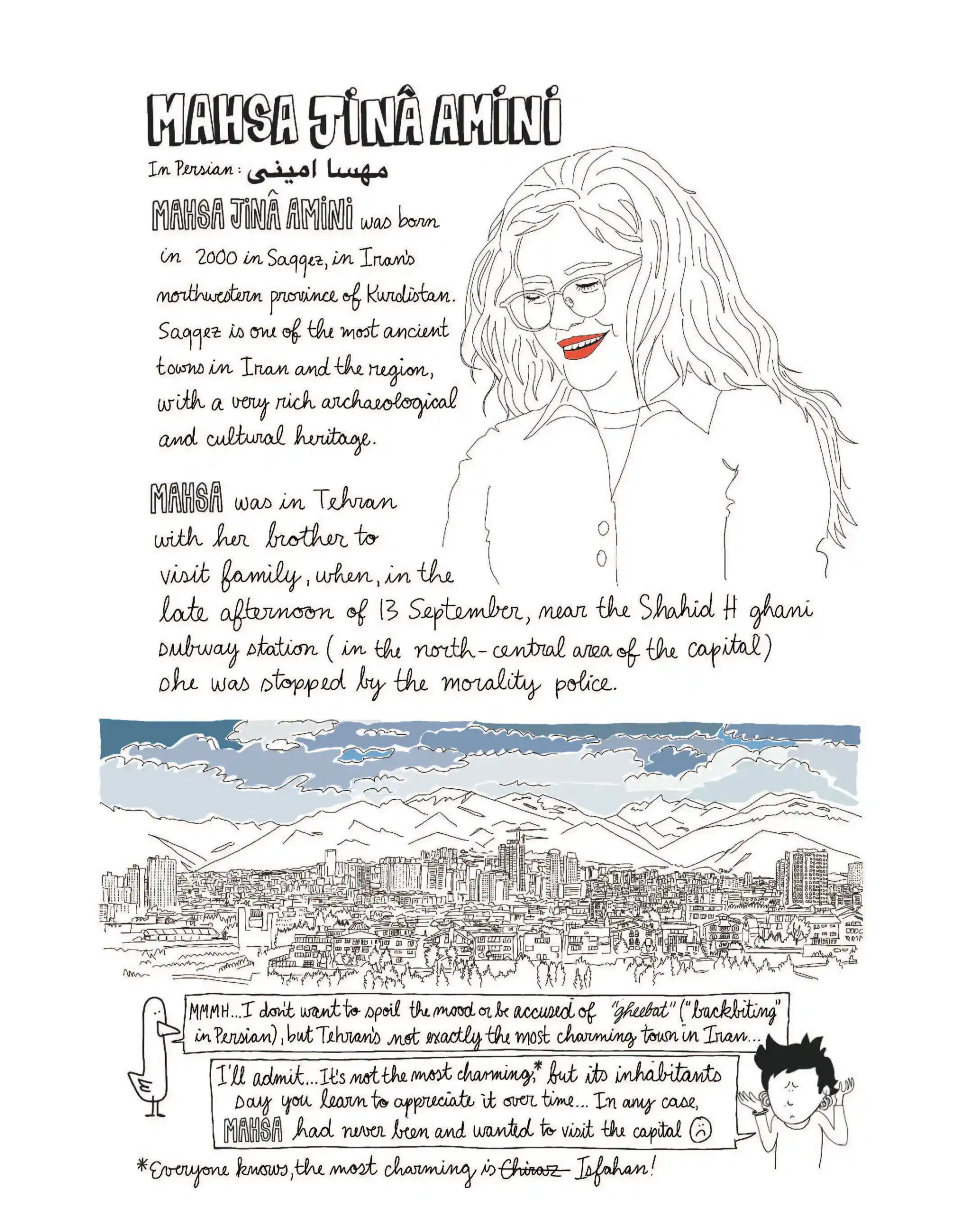 Marjane Satrapi ülkesindeki bu büyük olayın hikayesini anlatmak için dünyanın dört bir yanından bir gazeteci, aktivist, akademisyen, sanatçı ve yazarı bir araya getirerek tanıklık eden bir çizgi roman serisi yarattı. Kitaptaki çizimlerde sanatçı “Kadın, yaşam, özgürlük” sloganını bağıran kalabalıklardan başörtülerini çıkaran kadınlara, rejimin acımasız baskısına ve protestolara katıldıktan sonra idam edilen genç İranlı erkeklere kadar baskıcı İran rejiminin tüm mağdurlarını anıyor; özgürlük mücadelesine saygı duruşunda bulunuyor.