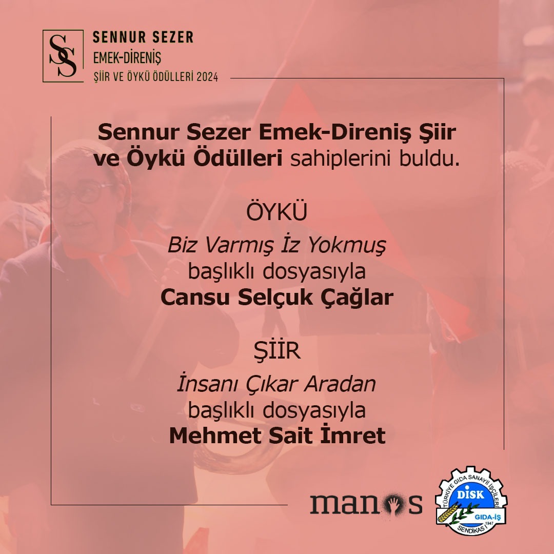 Gıda-İş Sendikası ve Manos Kitap tarafından düzenlenen 2024 Sennur Sezer Emek-Direniş Şiir ve Öykü Ödülleri töreni bugün gerçekleşti. Türkiye’nin en önemli şairlerinden Sennur Sezer adına bu yıl dokuzuncu defa düzenlenen Sennur Sezer Emek-Direniş Şiir ve Öykü Ödülleri sahiplerine takdim edildi. Temmuz ayında açıklanan değerlendirme sonucunda öykü dalında Cansu Selçuk Çağlar ‘Biz Varmış İz Yokmuş’ dosyasıyla, Mehmet Sait İmret ise ‘İnsanı Çıkar Aradan’ adlı şiir dosyasıyla ödüle layık görüldü.
