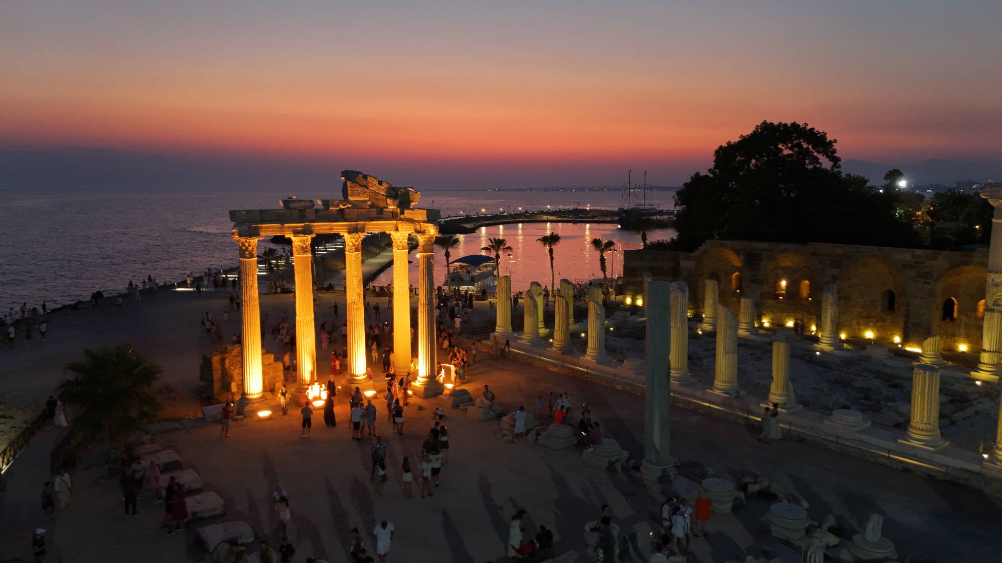 Geç Bronz Çağı, Helenistik, Roma ve Bizans dönemlerine ait izler taşıyan Antalya’nın Manavgat ilçesindeki Side Antik Kenti, “Geleceğe Miras Projesi” ile gece de ziyaretçilerini ağırlıyor.