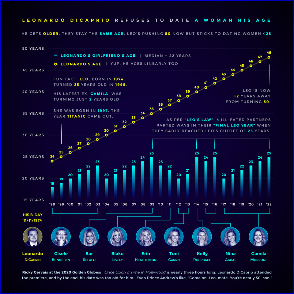 Dört yıldır birlikte olduğu Arjantinli model sevgilisi Camila Morrone’den tam da Morone’nin 25 yaşına basmasının ardından ayrılan Oscar ödüllü 47 yaşındaki oyuncu Lonardo DiCaprio dünya çapında sosyal medyanın başlıca konusu haline geldi. Bunun sebebi de bir Reddit kullanıcısının hazırladığı yukarıda da gördüğünüz grafik. Gerçi bu paylaşım yapıldıktan kısa süre sonra silindi ama yine de hem pek çok haber sitesi hem de yüzbinlerce sosyal medya kullanıcısı alıp bunu paylaştı. Gerçekten de, DiCaprio’nun kız arkadaşları için 25 yaş sınırı varmış gibi gözüküyor; bugüne kadar birlikte olduğu 8 kadından da, onlar 26 yaşına varmazdan önce ayrılmış oyuncu.