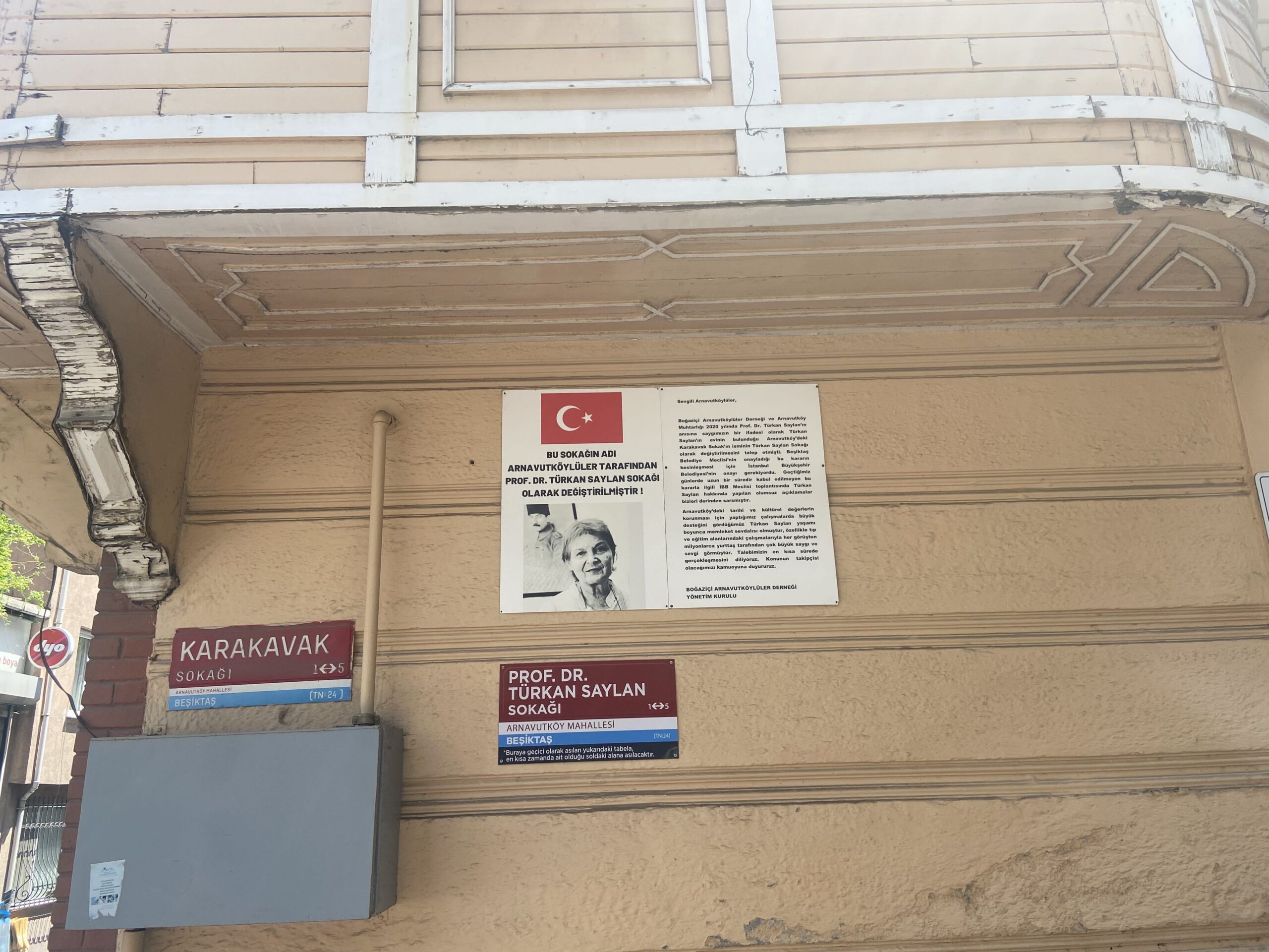 Hala sokağın tabelası değişmemiş. Karakavak Sokağı yazıyor. Ama sokağın adına zaten mahalleli şerh düşmüş. Burası Prof. Dr. Türkan Saylan Sokağı olarak kabul ediliyor.
