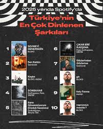 2025’te Spotify’da en çok dinlenen şarkı BLOK3’ten Sevmeyi Denemedin olurken, zirveyi takip eden parça Semicenk’ten Sen Kaldın oldu.