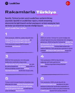 2024 yılında Türk sanatçılar tüm dünyada kullanıcılar tarafından oluşturulan 289 milyondan fazla çalma listesinde yer aldı. Bu çalma listelerinin 191 milyonu başta ABD ve Almanya’dakiler olmak üzere Türkiye dışındaki kullanıcılar tarafından oluşturuldu. Bunun sonucunda 2024 yılı boyunca Türk sanatçıların kendi ülkeleri dışında elde ettikleri telif gelirlerinin oranı arttı. Türk sanatçıların 2024 yılında Spotify’da sağladığı telif hakkı gelirlerinin yarısından çoğu Türkiye dışındaki dinleyicilerden elde edildi.