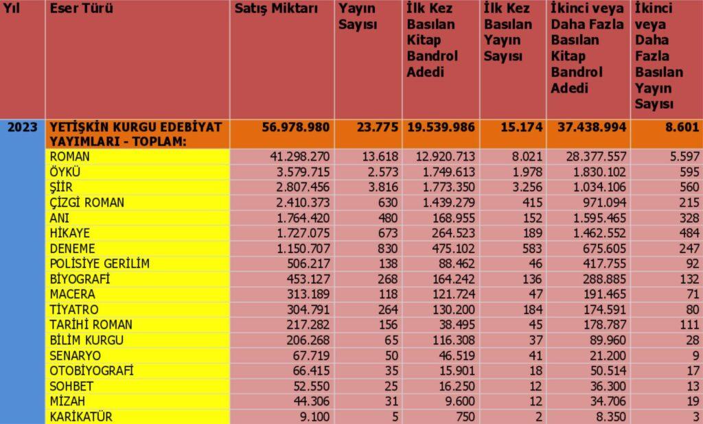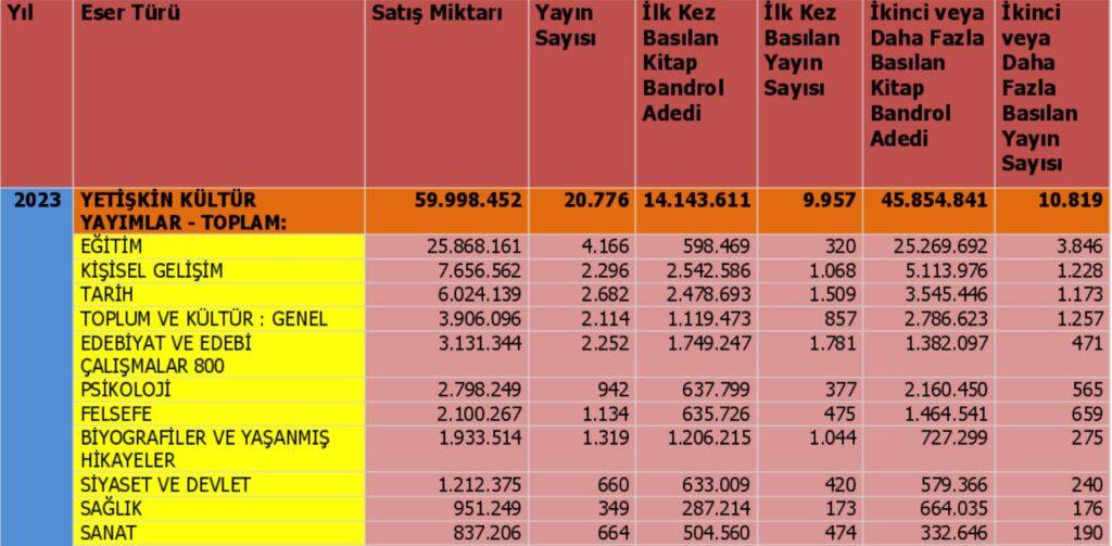 Yayımcı Meslek Birliği Federasyonu’nun hazırladığı yukardaki tabloda görüldüğü gibi yetişkin kültür yayımlarının sayısı (araştırma, inceleme) yıldan yıla düşüyor. Lakin yetişkin kurgu edebiyat kitaplarının oranı ise her yıl artıyor. Yani buradan yola çıkarak Türkiye edebiyat okumayı seviyor diyebiliriz. Hatta 2022’te 34 milyon adet yetişkin kurgu edebiyat kitabı basılırken 2023’te bu rakam 56 milyona çıkmış.