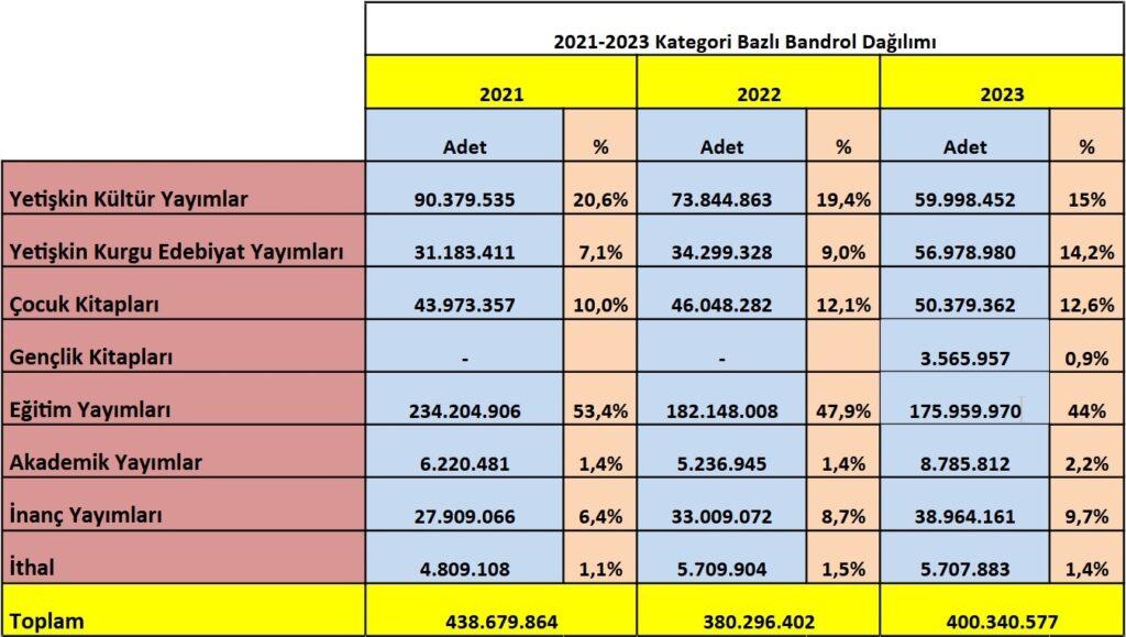 Bu verilerden sonra kitap adetleri ve kategori oranlar üzerinden 2021, 2022 ile 2023 kitap yayınlarının kıyaslanmasına bakalım.
