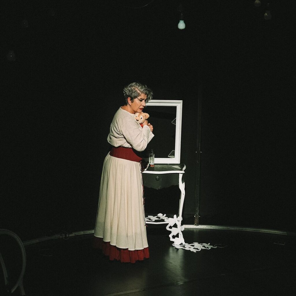 Feri Baycu Güler ile Altuğ Görgü’nün yönetimindeki oyun, tek mekânda, birkaç parça eşyayla ve etrafa saçılmış kâğıttan çocuk figürleriyle kendi haline bırakılmış bir ev dekorunda geçiyor. Sahne tasarımında göstermeci küçük detaylar dışında (oyuncak, kâğıt bebekler vs.) bütünsel olarak hikâyeyi kavrayan bir tasarımdan bahsedilemez. Yine de en azından bende, özensizliğine terk edilmiş, yarı boş bir ev hissi yarattı dekor. Öte yandan zaten sürece kısa bir oyunun girizgâhında iki tam şarkı boyunca oyuncuyu müziğe eşlik edip kendini sakinleştirmeye çalışırken izlememize gerek var mıydı… Sanmam.
