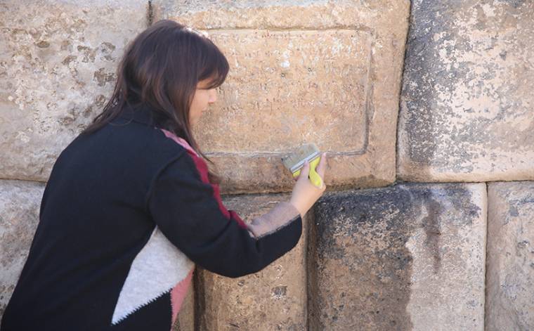 Kitabelerin daha rahat okunabilmesi için estampaj (kazınmış ya da kabartma olarak belli bir yüzeye işlenen bezemeler ve yazıların üstüne kağıt konarak kopyalanması) çalışması yapan kazı ekibi bulunan taşları restorasyon çalışmalarında kullanılmak üzere muhafaza altına alıyor.